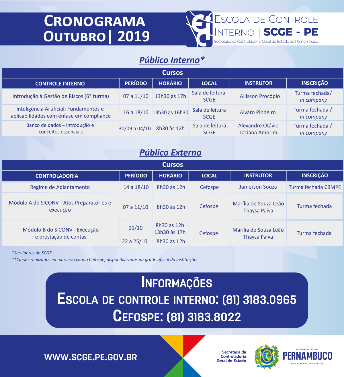 A Escola de Controle Interno da Secretaria da Controladoria-Geral do Estado (ECI/SCGE) promoverá, em parceria com o Centro de Formação dos Servidores e Empregados Públicos do Estado de Pernambuco (Cefospe), seis cursos dentro da programação do mês de outubro. Ao todo, serão capacitados presencialmente 140 colaboradores do Poder Executivo Estadual, em temáticas como gestão de riscos, tecnologia e convênios. Como todas as atividades foram planejadas para atender demandas específicas de alguns órgãos e entidades, as turmas já estão com todas as vagas preenchidas, não havendo inscrições de novos participantes.